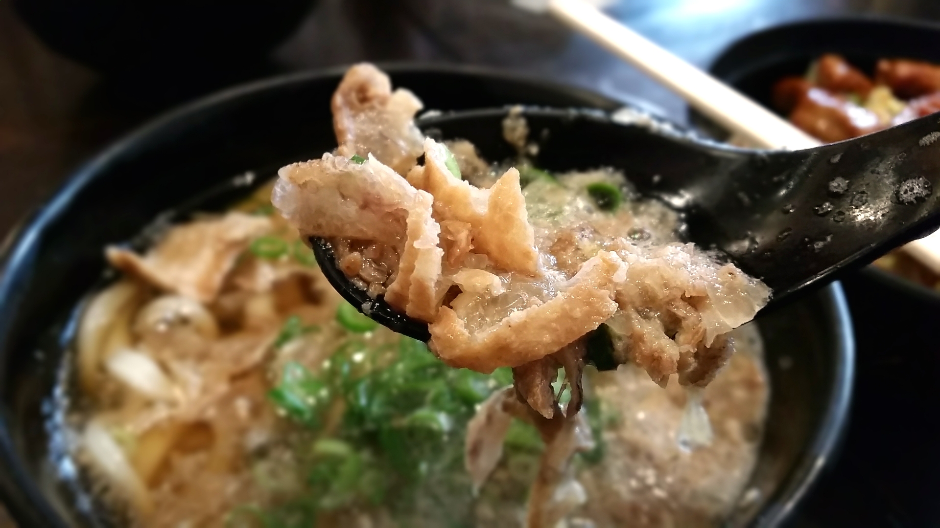 うどん(麺)自体の良し悪しはもはや問題やない。かすと、その旨味の染み出したスープがメインなんやで。かすの食感は麩のようでいて、しかし歯ごたえのあるガワもあり、噛むほどホルモンのジャンクな旨味があふれ出てきて、そらもう、たまりませんな!しあわせが舌の表面を撫でて、頬が自然とゆるみます。ホルモン丼は、まあ、つまりコテッチャンを乗せたご飯や。甘いタレ味のこれも、まあ強いて言えばトッピングやね。かすのね。つまり、今日食べにきたのはかすの、うどんとホルモン丼添えや。いや実際。
